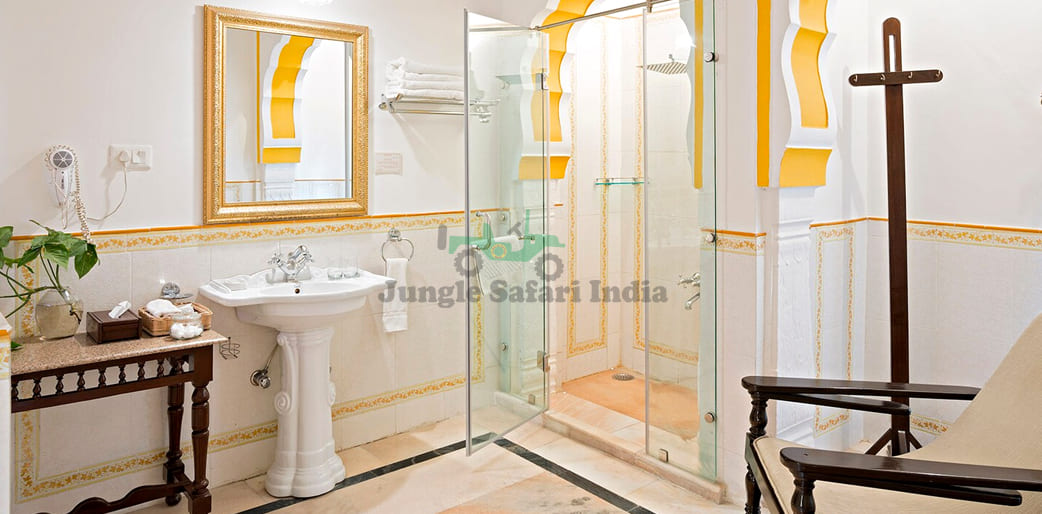 This is a luxurious property and a spacious one. It has 99 king-size deluxe and super deluxe rooms and also well-decorated suites. All the rooms of this resort give the feel of a Maharaja’s room and the suites, oh the suites will make you take a lot of pictures. The suites look nice and have everything that one can think of. The suites also have private terraces and stunning views which will make you fall in love with this property. Facilities of this resort include laundry service, doc on call, money exchange, travel desk, travel guide, free internet, wifi, car parking, recreation area, power backup, fitness center, Spa, swimming pool, lancer’s bar, a board room, and many more. The dining areas of this property have fine mirror work on the walls and ceilings which attracts the guests. Romantic candlelight dinners can be arranged at Hathi Kund which is a lustrous open space that is built with white marble and hundreds of dimly lit lamps that create a magical experience at night. This property also has an amphitheater with plush architecture and good light and sound.